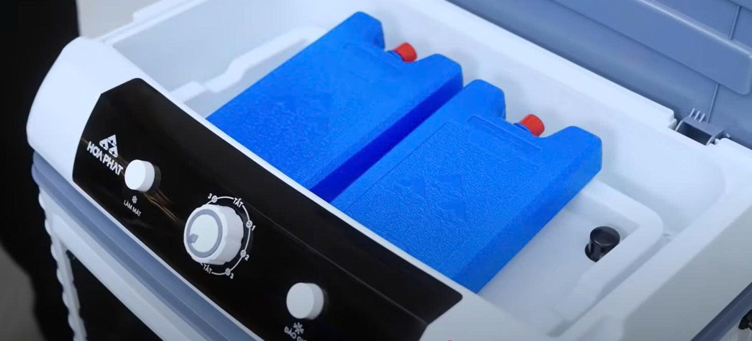 - Đi kèm 2 đá khô nâng cao hiệu suất làm mát. Đây là 1 loại đá hóa học, khi muốn làm lạnh, bạn cho vào ngăn đá tủ lạnh (đá này có thể tái sử dụng) rồi đặt vào bình chứa nước, đá khô sẽ làm lạnh nước cho hơi nước tỏa ra mát sâu hơn