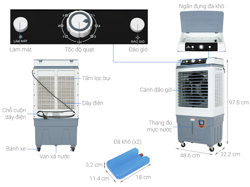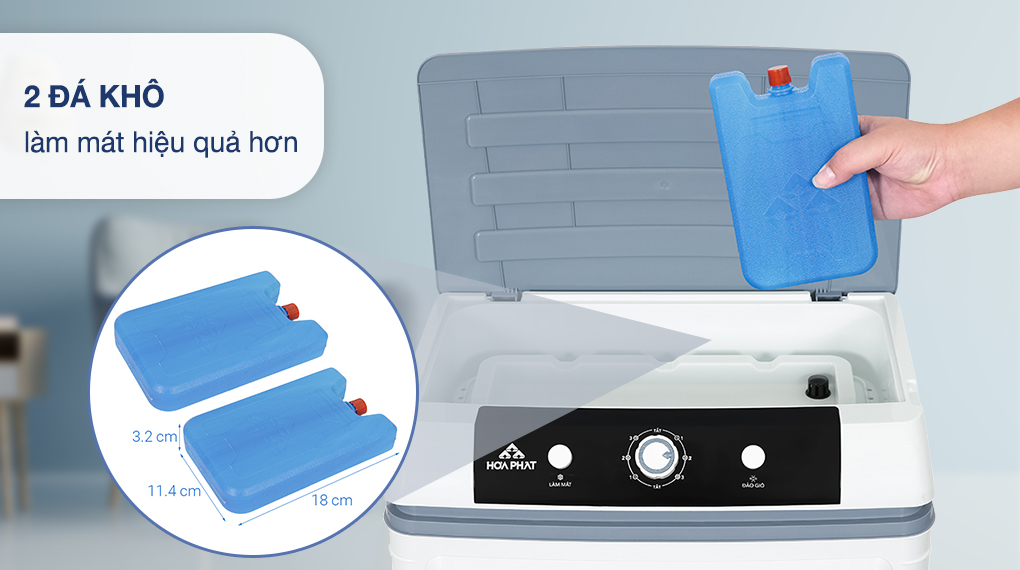 - Đi kèm 2 đá khô nâng cao hiệu suất làm mát. Đây là 1 loại đá hóa học, khi muốn làm lạnh, bạn cho vào ngăn đá tủ lạnh (đá này có thể tái sử dụng) rồi đặt vào bình chứa nước, đá khô sẽ làm lạnh nước cho hơi nước tỏa ra mát sâu hơn