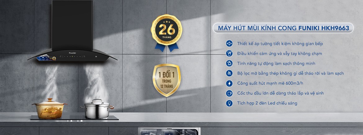Đổi hàng miễn phí sau 7 ngày mua Máy hút mùi kính cong Funiki HKH9663