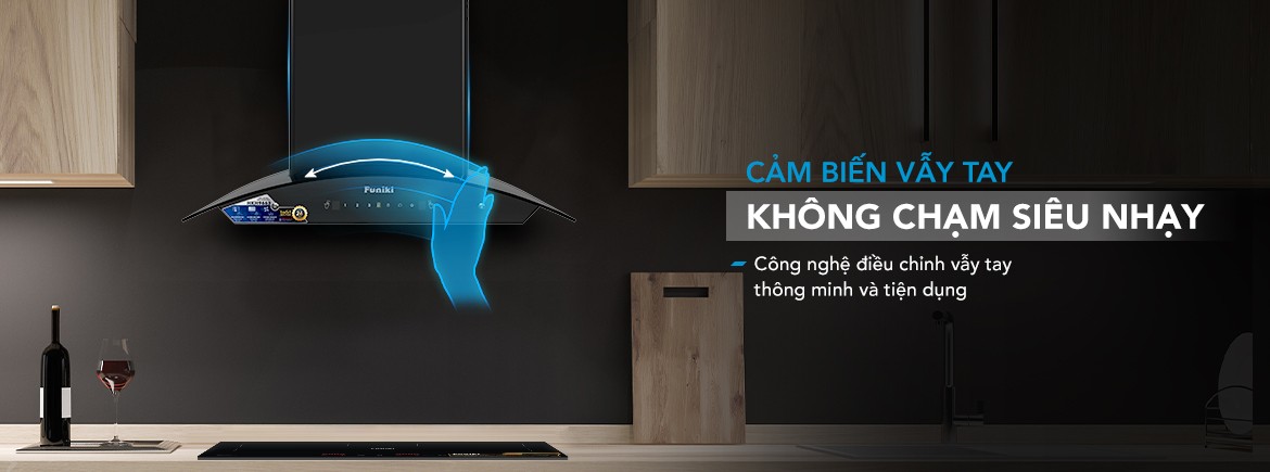 Máy hút mùi kính cong Funiki HKH9663 được trang bị công nghệ điều khiển bằng cảm biến vẫy tay thông minh siêu nhạy, không cần chạm mà vẫn có thể bật/tắt máy, thay đổi mức độ hút mùi dễ dàng mà không không sợ tay dính dầu mỡ hay dính thức ăn đang chế biến làm bẩn bề mặt thiết bị khi sử dụng.