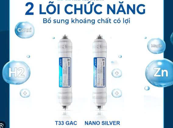 Gồm 2 lõi lọc nước chức năng : T33 GAC có tác dụng khử mùi, tạo vị trong nước, lõi Nano Silver có tác dụng diệt khuẩn, chống tái nhiễm khuẩn
