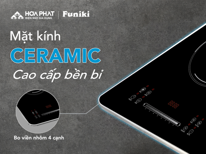 Về thiết kế, Bếp từ đôi Funiki HPC 3D12 hữu mặt kính Ceramic cao cấp có khả năng chịu lực và chịu nhiệt vượt trội. Loại kính này được đánh giá cao về độ bền, khả năng chống trầy xước và dễ dàng vệ sinh sau khi sử dụng. Người dùng chỉ cần lau nhẹ bằng khăn ẩm là có thể loại bỏ vết bẩn và dầu mỡ bám trên bề mặt.