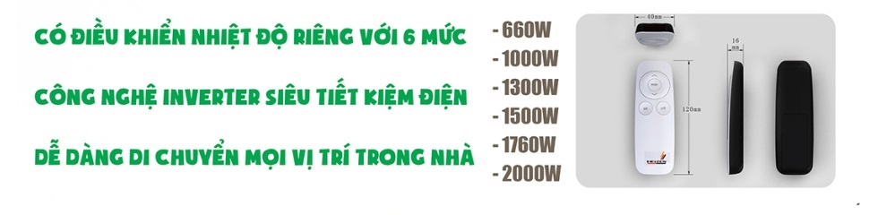 Heizen HEIT-R có điều khiển từ xa để điều chỉnh nhiệt độ với 6 mức nhiệt độ khác nhau. Người dùng có thể tăng giảm nhiệt độ với nút điều khiển lên xuống: từ: 660W - 1.000W - 1.300W - 1.500W - 1.760W - 2.000W.