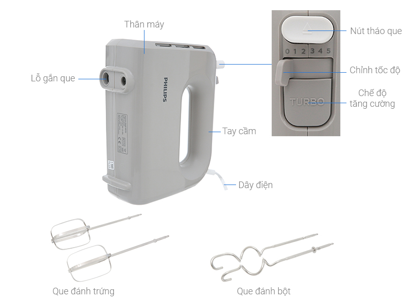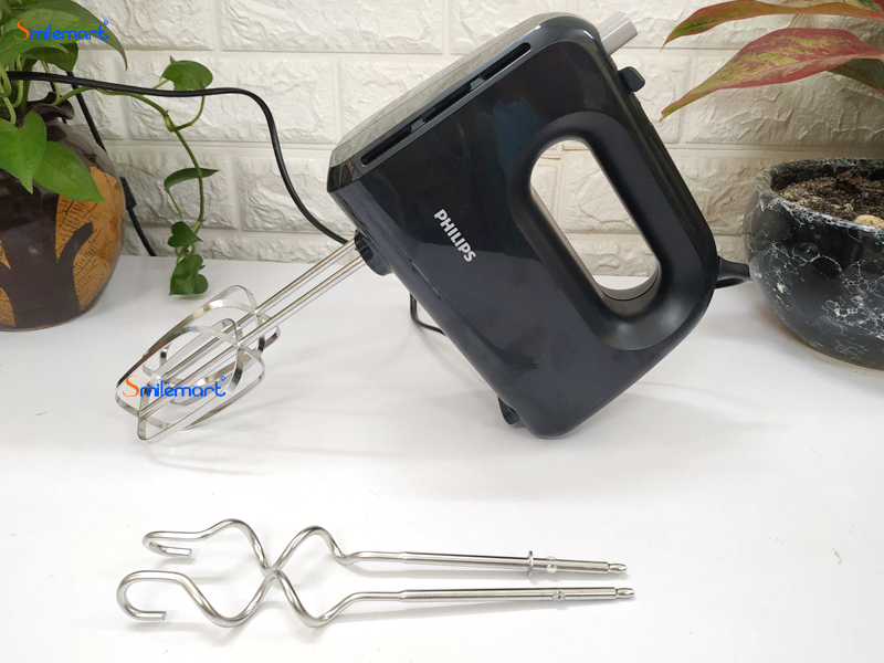 Đặc biệt, đi kèm theo đánh trứng Phillips HR3705 là 2 loại que trộn cho người dùng có thể thay đổi cho phù hợp với từng loại hỗn hợp thực phẩm khác nhau nhằm làm tăng hiệu suất trộn đều.
