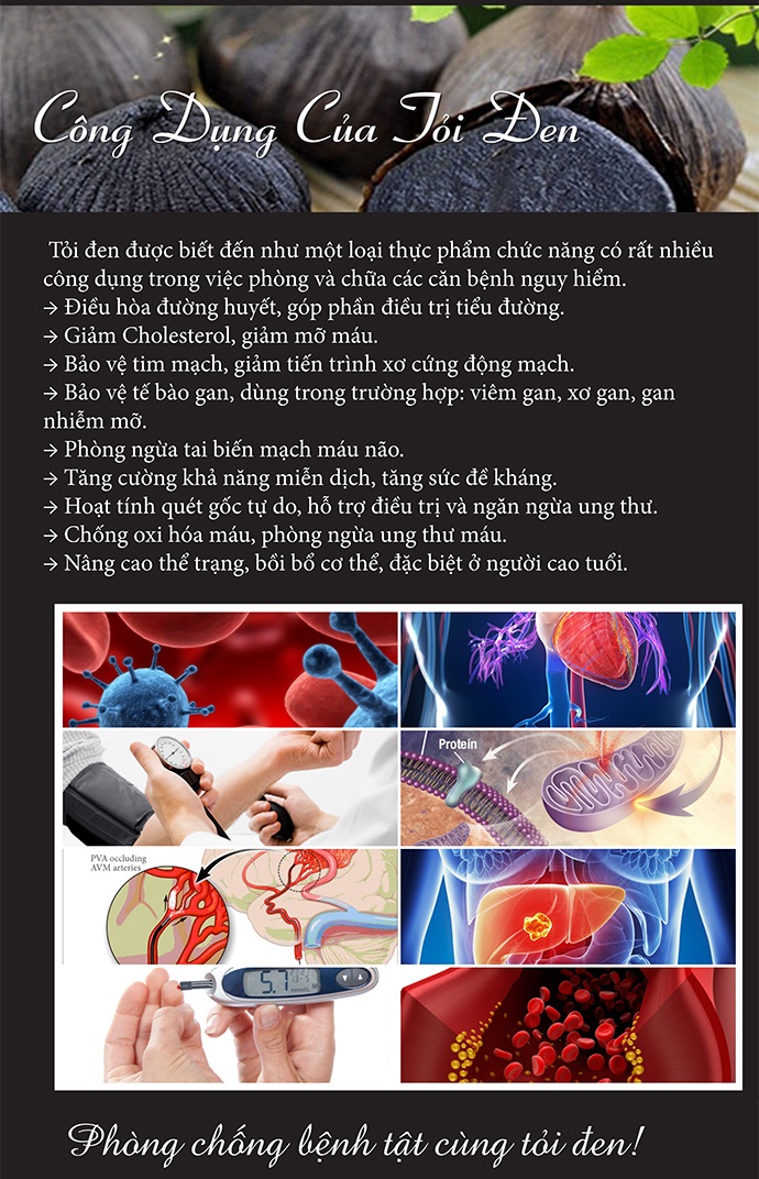 Tỏi đen có thể giúp bạn điều hòa đường huyết, giảm cholesterol, bảo vệ tim mạch, giảm tiến trình xơ cứng động mạch, phòng ngừa tai biến mạch máu não giúp tăng cường khả năng miễn dịch.