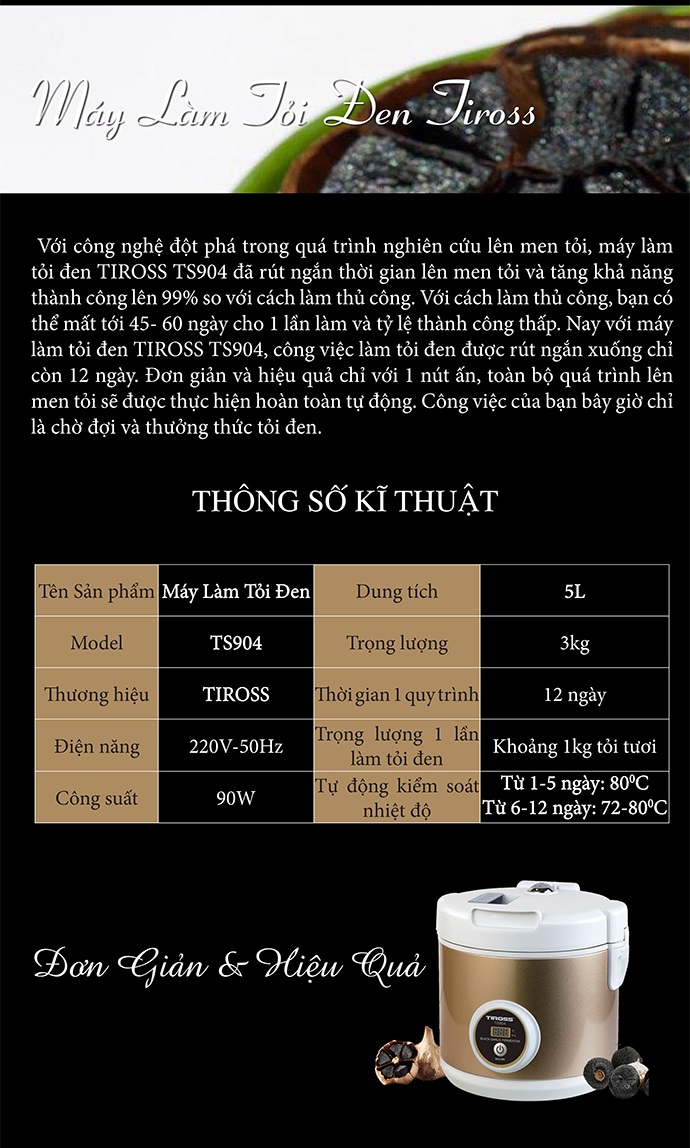 - Tiross TS904 là sản phẩm được nghiên cứu và sản xuất bởi hãng TIROSS (là hãng sản xuất đồ gia dụng nổi tiếng). Đây là chiếc máy được thiết kế chuyên biệt cho việc lên men tỏi đen mà không sử dụng để chế biến thực phẩm khác. Chính vì thế, nó luôn đảm bảo tính bền bỉ, ổn định lâu dài và chất lượng thành phẩm làm ra đạt tiêu chuẩn cao nhất.