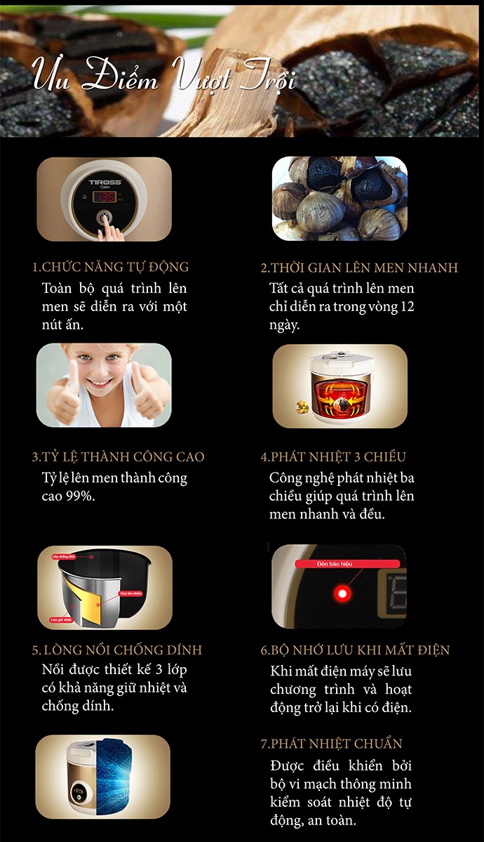- Tỷ lệ lên men thành công đạt tới 100%, trong khi làm tỏi đen thủ công bằng nồi cơm điện thất bại tới 50%. Đã làm bằng máy TIROSS TS904 chuyên dụng là chắc chắn thành công.