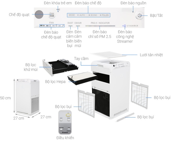 - Giữ bụi và các chất gây ô nhiễm hiệu quả với phin lọc tĩnh điện HEPA.