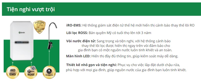 - Vòi nước điện tử sang trọng và tiện nghi, với hệ thống cảnh báo thay thế lõi lọc được tích hợp.