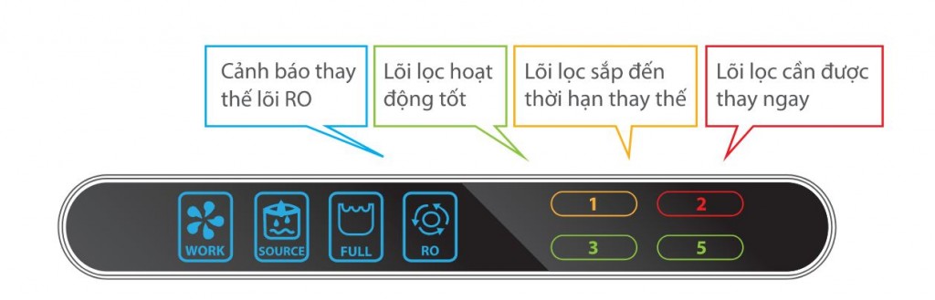 Cảnh báo thay thế lõi lọc: Căn cứ vào thực tế sử dụng – tiêu dùng nước tinh khiết, biểu tượng lõi lọc trên màn hình là màu xanh tức là lõi lọc hoạt động tốt, khi gần đến thời hạn thay thế lõi lọc thì trên màn hình của hệ thống sẽ hiển thị màu vàng để báo hiệu lõi lọc sắp phải thay thế. Khi biểu tượng là màu đỏ thì lõi lọc cần được thay thế ngay lập tức để đảm bảo chất lượng nước đầu ra tốt nhất.