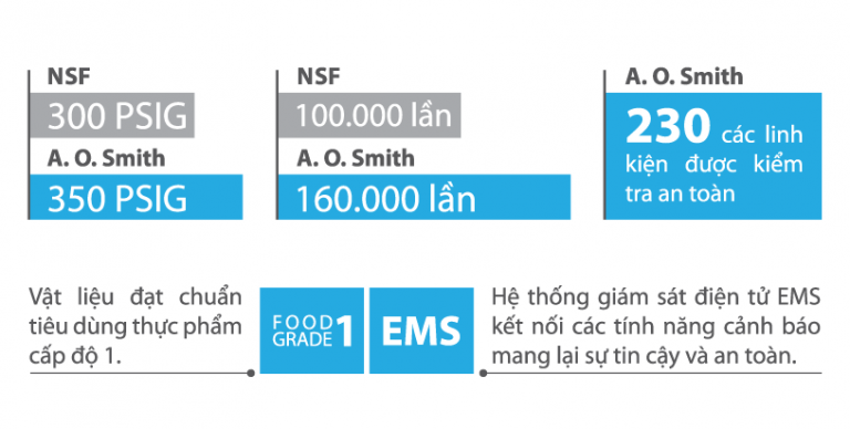 - Toàn bộ chi tiết cấu thành nên sản phẩm máy lọc nước A. O. Smith được NSF International (Hiệp hội an toàn thực phẩm và nước uống quốc tế của Mỹ) kiểm tra và chứng nhận đạt chuẩn NSF/ANSI 58 và 42.