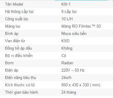 - Hệ thống gồm 8 cấp lọc cơ bản với màng R.O filmtec nhập khẩu trực tiếp từ Hoa Kỳ