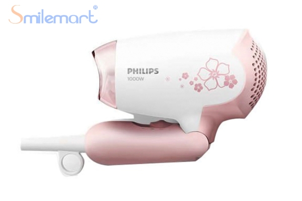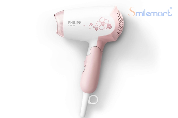 Máy sấy tóc Philips thiết kế màu trắng - hồng xinh xắn, kiểu dáng nhỏ gọn, dễ sử dụng với tay cầm có thể gập lại, thuận tiện cho việc bỏ vào túi xách, ba lô và mang đi du lịch.