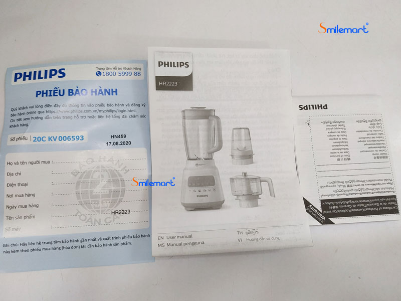 Đổi hàng miễn phí sau 7 ngày mua Máy xay sinh tố Philips HR2223 có thiết kế hiện đại, bền bỉ với cối xay làm bằng nhựa kháng vỡ có dung tích 2 lít giúp bạn xay được khối lượng thực phẩm lớn, thân máy làm bằng nhựa cao cấp chịu lực, lưỡi dao làm bằng thép không gỉ đảm bảo an toàn, không thôi nhiễm các chất độc hại ở nhiệt độ cao.
