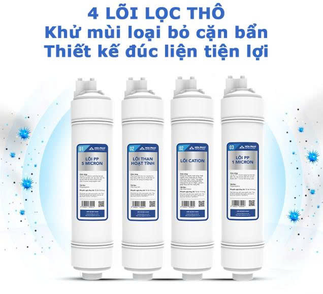 | Hệ thống lọc thô: | 4 lõi lọc thô đúc liền (PP 5 micron, PP 5 micron, Than hoạt tính, PP 1 micron) |