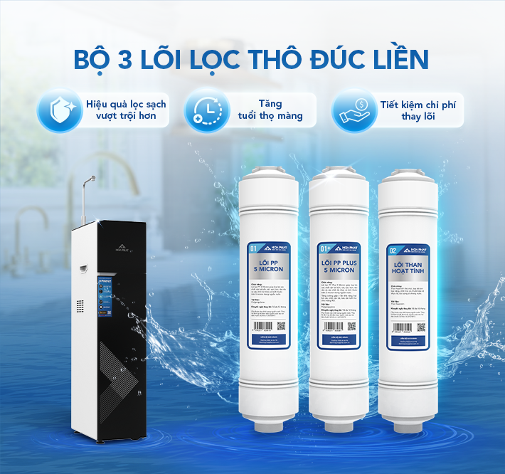 -Lọc Thô (3 lõi): Bộ 3 lõi lọc thô đúc liền thay nhanh mang đến hiệu quả lọc sạch vượt trội, kéo dài 1.2 lần tuổi thọ màng RO và 1.5 lần tuổi thọ lõi lọc thô, giúp tiết kiệm 20% chi phí thay lõi, người dùng có thể tự thay lõi khá dễ dàng.