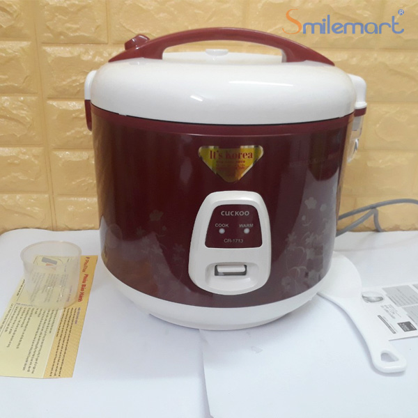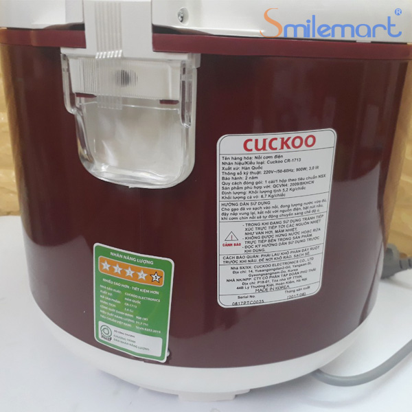 Đổi hàng miễn phí sau 7 ngày mua Siêu thị điện máy Smilemart là đại lý phân phối chính thức sản phẩm Nồi cơm điện CUCKOO CR-1713 giá cạnh tranh nhất, chất lượng dịch vụ tốt. Nồi cơm điện CUCKOO CR-1713 được làm bằng thép phủ sơn đặc biệt chống rỉ và có độ bền cao. Lớp bông thuỷ tinh giữ nhiệt làm nồi cơm ấm, ngon lâu và tiết kiệm điện hơn.