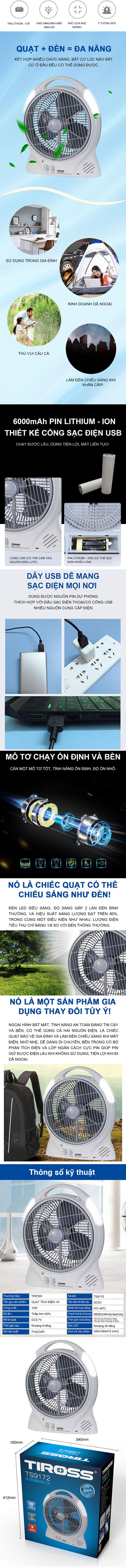 Quạt sạc điện Tiross TS9172 là quạt sạc dùng pin có dung lượng 6000 mAh, có thể sạc lại, có nhiều tốc độ gió để lựa chọn. 3 cánh quạt được làm bằng nhôm với đường kính 25cm.