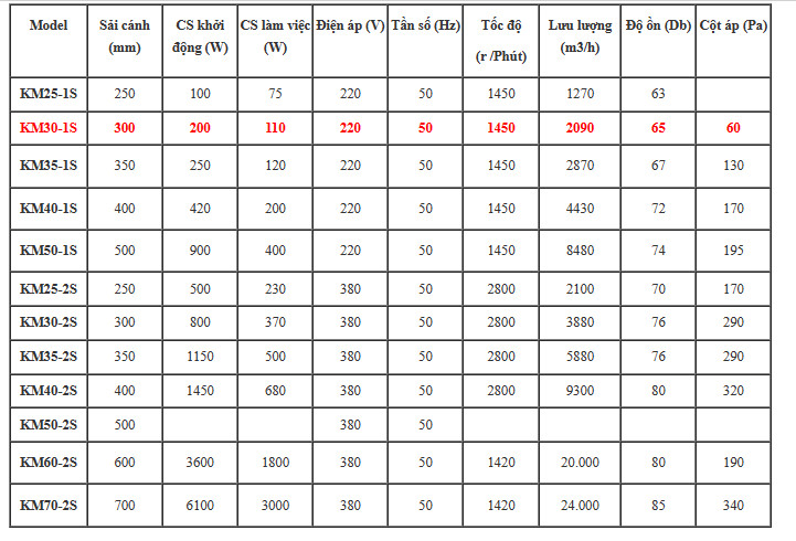 Thông số kỹ thuật các dòng quạt cùng loại: